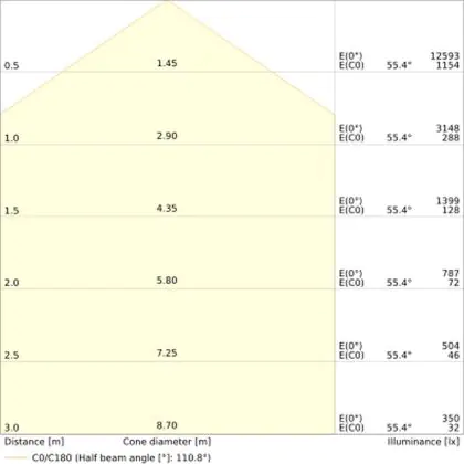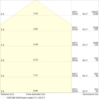 The colour code is a combination of colour rendering (CRI) and light colour (Kelvin). The first number indicates the colour rendering (1 = very poor colour rendering, 9 = maximum colour fastness). The second and third number contains the light colour. Example: the colour code 830 consists of good colour rendering (8) and warm white light (3000K). |