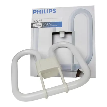 Philips PL-Q 4P are flat 2D type florescent lamps, very energy efficient with a quadrant shape. The PL-Q 4 Pin range is compatible with an electronic ballast. Each compact fluorescent lamp of this range has a base type GR10q with 4 metal pins. Philips PL-Q 38W 835 4P lamps have a size of 107 cm.